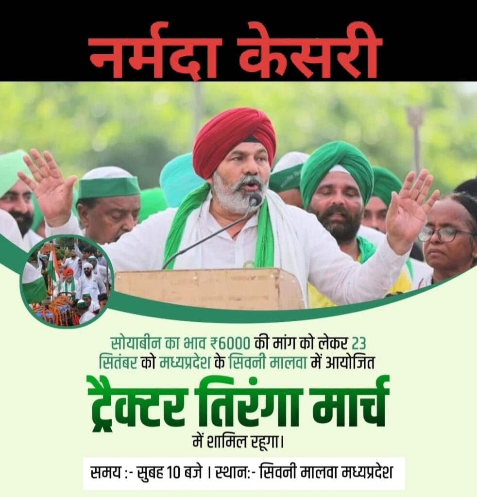 किसान को वर्तमान में सोयाबीन, मक्का और धान उपज का जो दाम मिल रहा, उससे लागत भी नहीं मिल रही है। किसानों को उपज का बाजिब मूल्य दिलाने के लिए भारतीय किसान यूनियन ने एसडीएम के माध्यम से प्रदेश सरकार से सोयाबीन के दाम 6000 रुपए, मक्का 3000 रुपए, धान 3100 रुपए करने की मांग को लेकर अनेक ज्ञापन दिए थे इसके बाद भारतीय किसान यूनियन के पदाधिकारी ने 23 सितंबर को तिरंगा ट्रैक्टर रैली के आंदोलन की चेतावनी भी दी थी । इसी क्रम में तिरंगा ट्रैक्टर रैली का आयोजन किया गया है। सोयाबीन के भाव एमएसपी पर 6 हजार रुपए करने की मांग को लेकर मध्यप्रदेश के किसान लगातार आंदोलन और प्रदर्शन कर रहे हैं। अलग-अलग किसान संगठन और कांग्रेस ज्ञापन देकर प्रदर्शन कर रही है। किसानों की इस मांग के लिए आवाज उठाने अब मध्य प्रदेश के नर्मदा पुरम जिले की सिवनी मालवा तहसील में भारतीय किसान यूनियन के राष्ट्रीय किसान नेता राकेश टिकैत की भी एंट्री होने वाली है ।